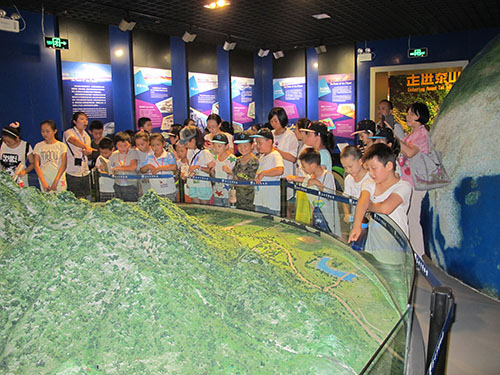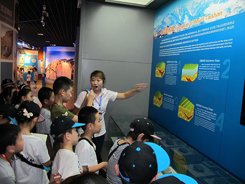 2015年8月11日,《小记者报》的50多名小记者在老师带领下,来岱庙参观地质博物馆展厅。泰山地质公园博物馆位于岱庙雨花道院北侧,是泰山世界地质公园的重要组成部分。展览陈列面积760平方米,于2005年10月建成向游人开放。泰山地质公园博物馆共分名人与泰山、地质知识科普、人文历史、地质遗迹、生物资源等 7个功能厅。馆内收集展示了各类岩石矿物标本近百余种,动植物标本300余种,以通俗的文字、简洁的图片,全面细致地向游人介绍了地质基础知识、泰山独特的地质资源、悠久的人文历史、多样的物种及泰山地质研究成果等内容。