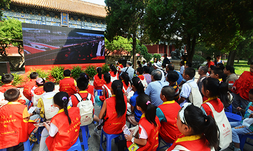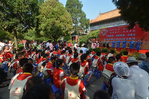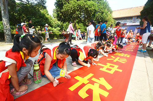 来自老年大学的老人们、岱庙的导游员及小主人报记者站的小记者们以歌曲、诗歌、演讲等多种形式,让现场观众回顾了那个遥远的抗战年代、对今天美好生活的珍惜以及表达对爱好和平、祝福祖国的美好愿望。现场的观众和游客深受感染,纷纷拿起笔同孩子们一起在写有“铭记历史、珍爱和平、振兴中华、共筑梦想”长条横幅上签下自己的名字。此外,泰山学者李继生还向孩子们现场讲述了抗战期间岱庙宝物被日本特务偷盗以及后为人们合力追回将宝物追回的过往历史。