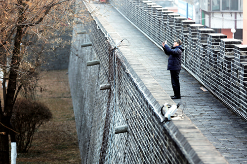 在岱庙西侧城墙上,一位市民在用手机拍照。