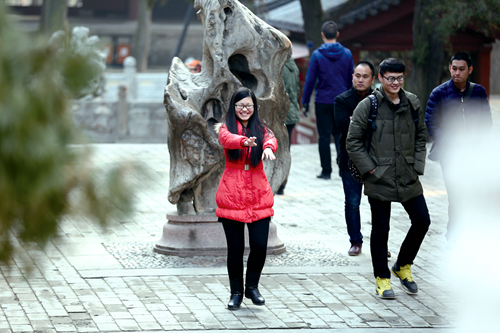 1 月9 日下午,记者从正阳门踏进岱庙,寒冬中的岱庙别有一番风味,不同于别处,院中郁郁葱葱的柏树让人忘记了冬季,忘记了寒冷,只想一个人慢慢地探寻欣赏。从唐槐院里沿着台阶走上岱庙城墙,站在高处,整个古建筑映入眼帘,不同于南方的温秀清灵,岱庙建筑群有着北方的厚重与沧桑,一座赏心悦目的古典园林呈现在眼前,内心是无法言说的尊慕与震撼。城墙上的一砖一瓦都在诉说这这座古建筑的历史,嵌于墙中的石刻则记载了这座古建筑群的厚重。闭上双眼,聆听鸟叫的声音,感受都市之外难得的静谧;伸出双手,仿佛能触摸到不远处枝头歇脚的鸟儿。