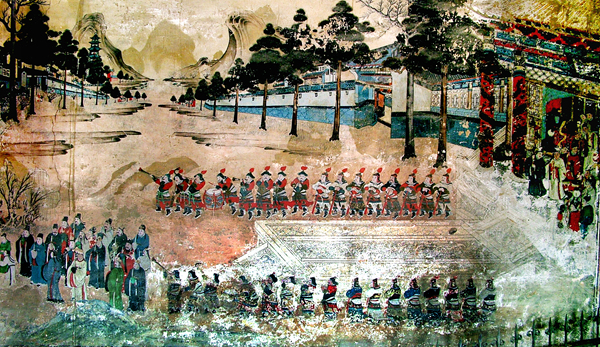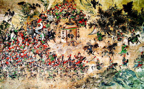 可那些画师只想着如果画不好画稿,皇帝怪罪下来会丢了性命,无法安心画画。就在画师不知所措的时候,县令夫人传出话来:“皇上不是嫌你们画得不够气派威风吗?皇上来封禅的时候你们都见过了,照着那种场面画下来,皇上准会满意。”这一句话提醒了众画师,他们连夜赶制,次日便把画稿送到了县令手中。县令呈给宋真宗,果然赢得了皇上的欢心,于是,岱庙就有了气势宏伟的壁画。
