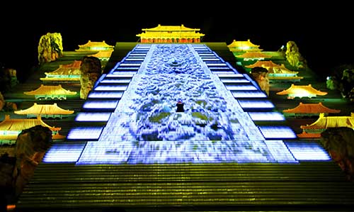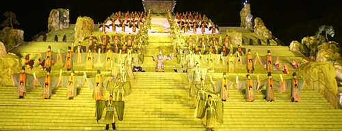 封禅大典是泰山独有的古老礼仪,构成了泰山崇拜与信仰的重要内容。由于这种礼仪的执行者是历代帝王所以格外引人注目,其影响更为深远,形成了从传说中的古史到宋代皇帝,是贯穿于原始社会和封建社会延绵相续的礼仪传统。以泰山历代封禅故事为创作背景,真实再现了古代五朝的市井文化和帝王封禅盛况,演出包括远古祭祀、金戈铁马——秦、儒风雅乐——汉、盛唐气象——唐、艺术王朝——宋、康乾盛世——清、青山依旧等7幕场景,在80分钟里带领观众穿越中华5000年的时空,用独特的方式去探寻泰山的深刻内涵、中华民族的历史故事。