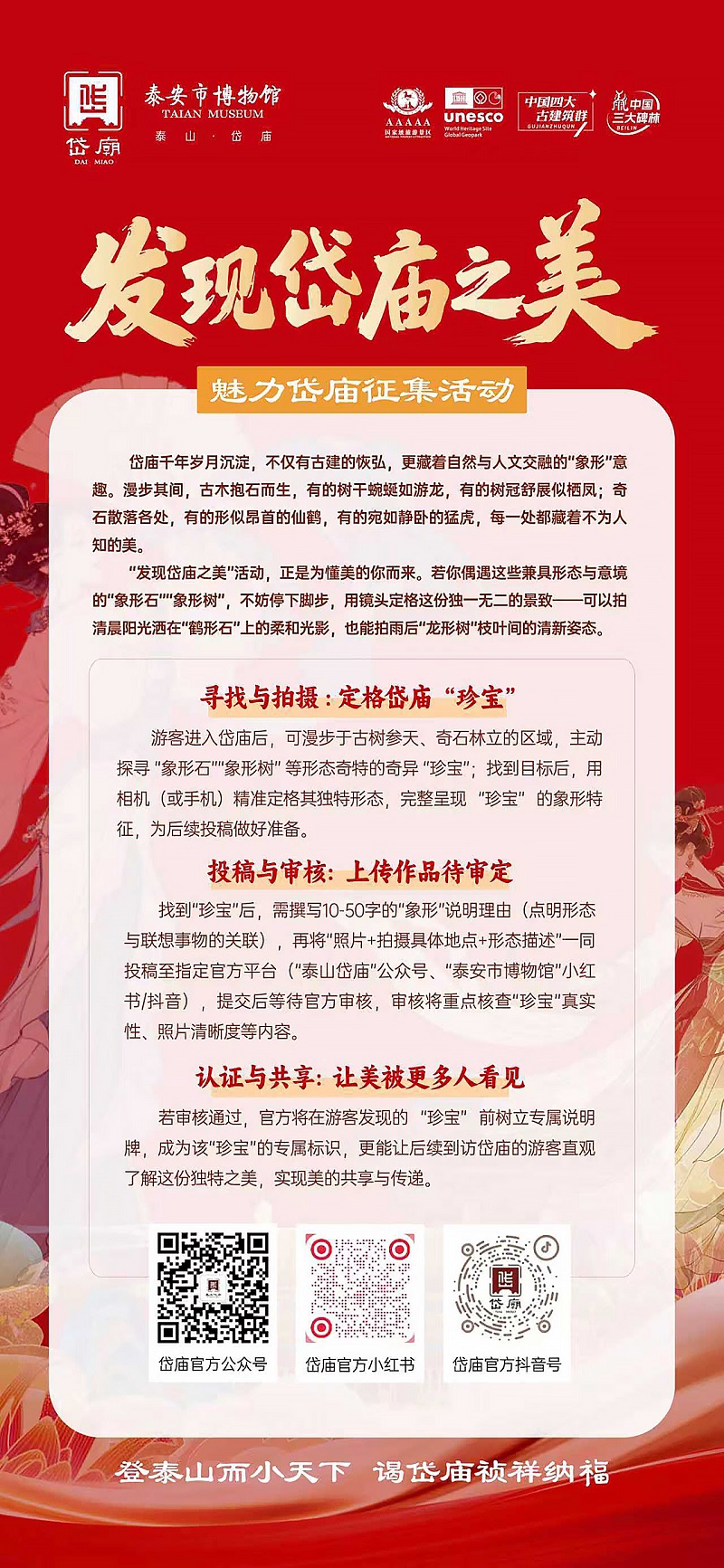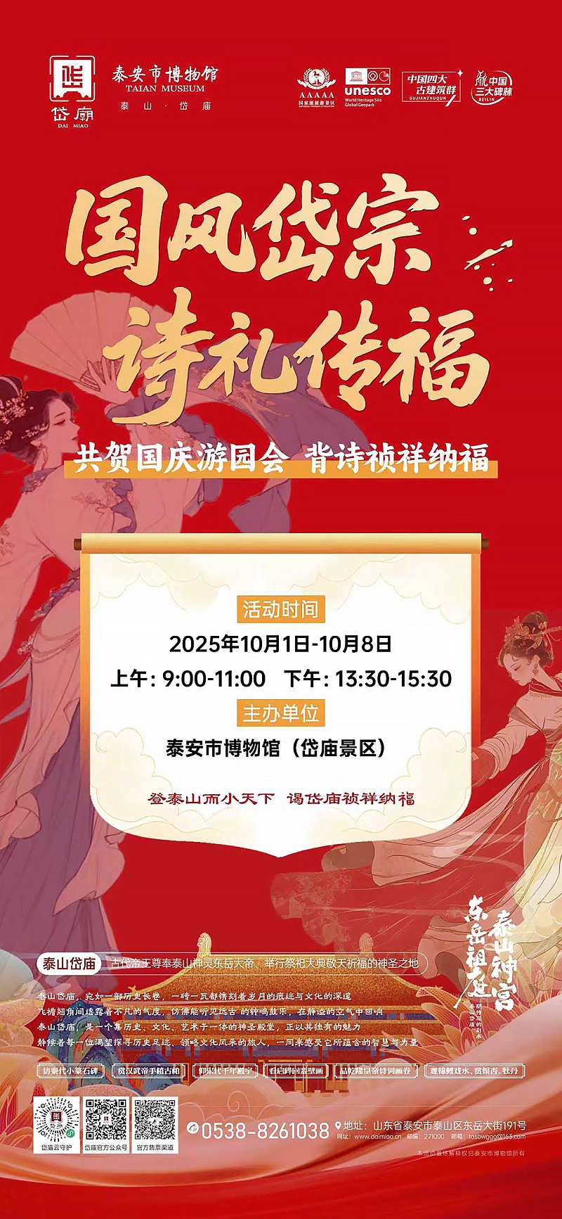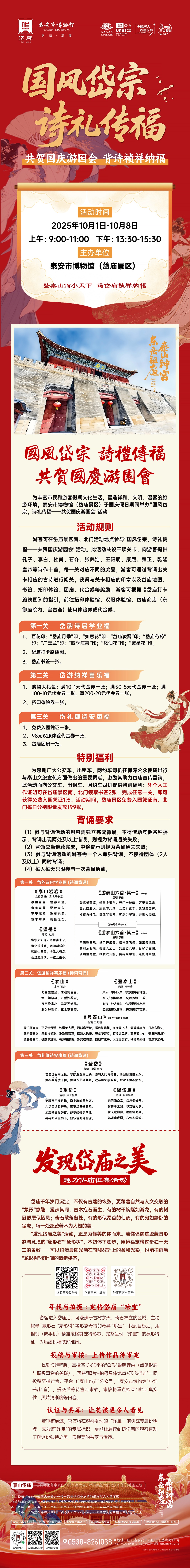 为丰富市民和游客假期文化生活,营造祥和、文明、温馨的旅游环境,泰安市博物馆(岱庙景区)拟于国庆假日期间举办主题为“国风岱宗,诗礼传福——共贺国庆游园会,背诗迎祥纳福”系列活动。