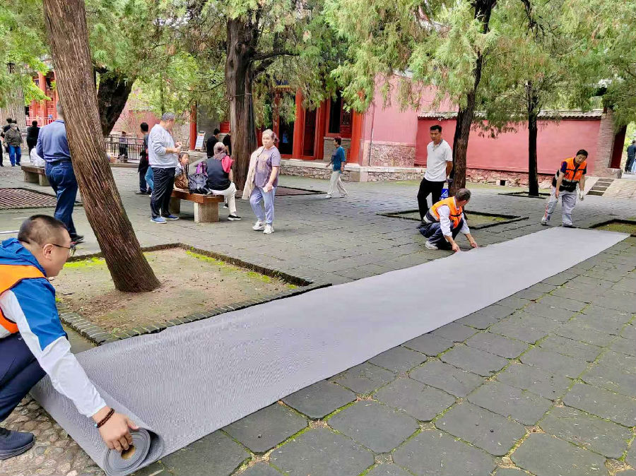 安全是旅游服务的底线。景区从“人”与“物”双维度发力,全面排查并防范安全隐患:一方面,组织卫生保洁人员开展安全生产专项培训,明确办公区、休息区、作业区“人走电断”的用电安全要求,同时强调工作人员自我防护规范,从源头提升人员安全意识;另一方面,针对岱庙内青砖地面阴雨天易滋生青苔的问题,安排专人高频次清理湿滑区域,同步探讨环保处理方案,在保障游客安全的同时兼顾文物保护。