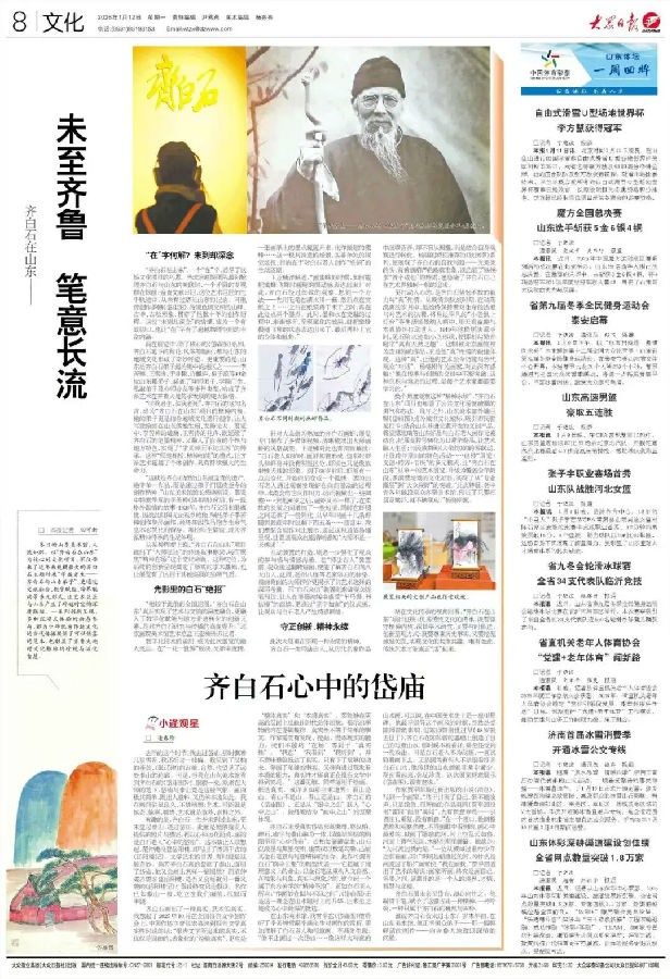齐白石画出了一种真实,艺术的真实。我想起了2025年10月在全国报告文学创作会上,中国作协主席张宏森谈到报告文学真实性时说的话:“报告文学所追求的真实,不仅仅是局部的、表象化的‘经验真实’,更应是‘整体真实’和‘本质真实’,要能够在更高的层面上反映出时代总体面貌,揭示出事物的内在逻辑规律,真实性不等于简单的事实,作家需要有发现、挖掘、提炼现实的能力。我们不能将‘在场’等同于‘真实性’,‘我在’‘我看到’‘我听到’,并不意味着就抵达了真实,只有下了足够的功夫,掌握了足够的事实,又拥有透过现象看本质的能力,真实性才能真正在报告文学中得到实现。”这番见解,同样适用于绘画。抵达真实,或许正如那三重境界:看山是山,看山不是山,看山还是山。齐白石的《岱庙图》,正是从“眼中之山”跃入“心中之山”,最终凝结为“画中之山”的完整体现。