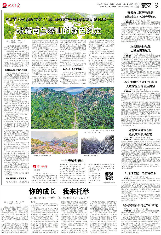 从不足2%到94.8%,从“赤无毛”到“青未了”,泰山的每一片绿,都藏着张耀南与泰山的绿色约定和一生坚守。在激情燃烧的岁月,他放弃正厅级职务,扎根泰山十余年,溜绳下崖、踏遍青山,用“做大事、不求做大官”的誓言,带领林业人把荒山变林海。那些栽下的树苗,如今已成参天大树,也成为刻在泰山上的精神丰碑。