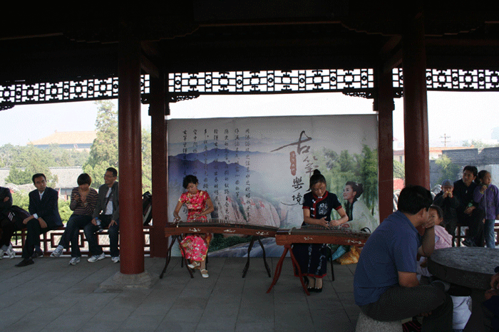 汉柏亭上,幽幽古筝,清脆悦耳,时而空荡悠扬、时而婉转回旋,如山涧奔流而出的如涓溪水,似“大珠小珠落玉盘”婉转入怀中。寻筝声而来,汉柏亭上,古装少女临风抚筝,眼前这副轻灵飘逸的山水画,使人恍若置身仙境,游客们静静地或坐或站在汉柏亭周围,享受着音乐的盛宴、体味着穿越时空的乐声浪涌,久久不肯离去。