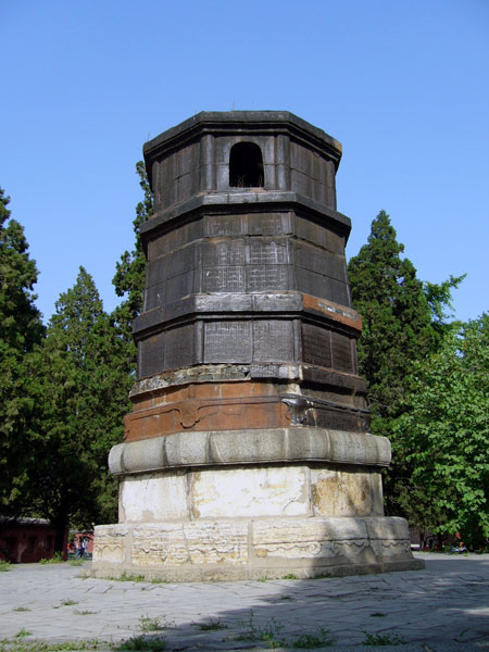 明嘉靖十二年(公元1533年)铸造。原在天书观(泰城上河桥北首)。抗日战争时期天书观被毁,铁塔也惨遭破坏。塔身原有十三级,分层铸造,而后套合。现仅存底部四层,每层高0.6—0.9米不等,通高3.8米,自第四级开始塔体四面各开一拱形门,并有纹饰出现。以下三级均铸有捐款者的姓名、籍贯及铸造者。