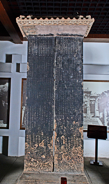 双束碑是因其形而得名。碑身二石并立,方座,覆仿土木结构歇山顶式帽。同座一顶,二石相束而立,所以有“双束”之谓,二石相依并存,又有了“鸳鸯碑”的说法。碑首代表天,碑座代表地,双碑代表高宗李治和武则天,寓意二人共同治理天下,这与当时的历史背景相吻合。