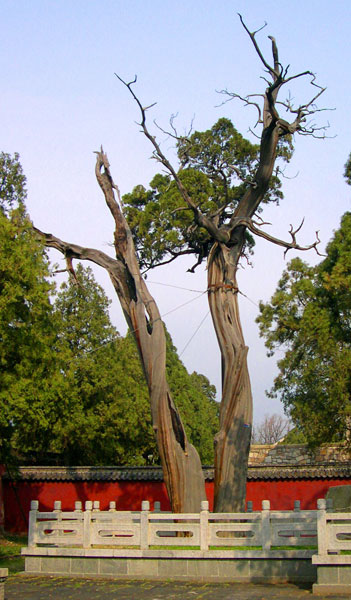 此柏为汉武帝亲植。双干连理,同根同生。新枝扶疏泛出新绿,表达生命意向,显示出生命不可遏止的生机和热情,兀突老干大音希声,用沉默的方式,倾诉生命存在价值和意义。展现出汉柏活着千年不死,死了千年不倒,倒下千年不朽的铮铮气节。