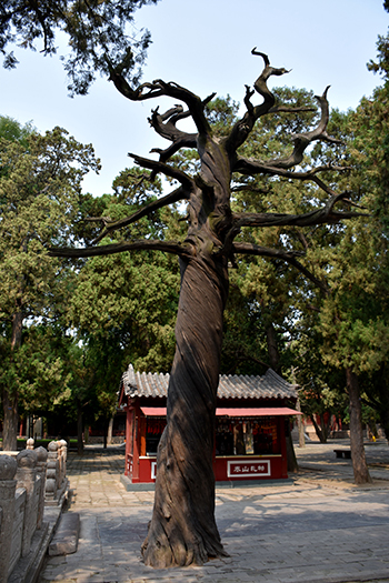 阁老池北有一枯柏,因其躯干以顺时针方向拧着向上盘旋,犹若铁骨,故名“宁(拧)死不屈(曲)”。