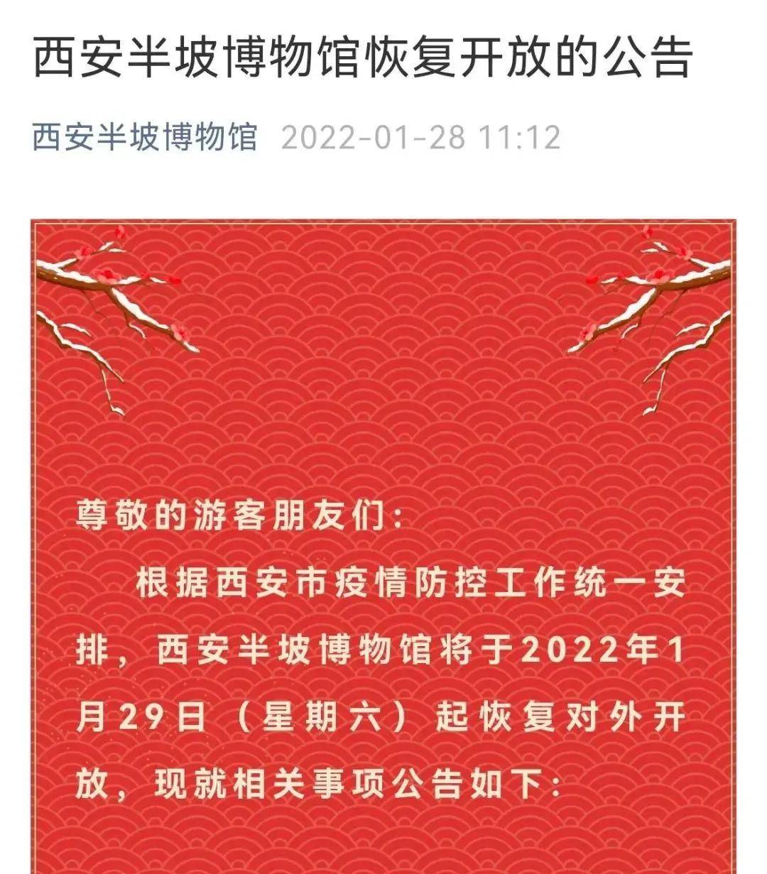 西安半坡博物馆1月29日恢复开放 每日接待人数不超过最大承载量75%。西安半坡博物馆发布公告,根据西安市疫情防控工作统一安排,西安半坡博物馆于2022年1月29日(星期六)起恢复对外开放。