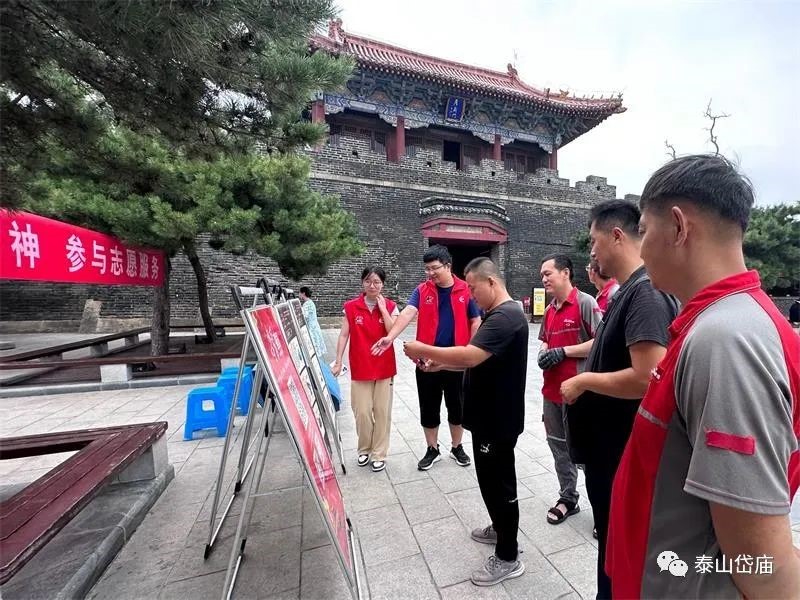 摆放介绍博物馆馆藏文物的宣传展板,为游客免费讲解文物的来历、价值和意义;发放有关文物知识和泰山景区景点信息的宣传折页、导览手册,耐心回答市民和游客的旅游咨询,以实际行动弘扬志愿服务精神。