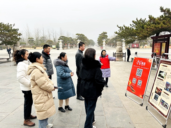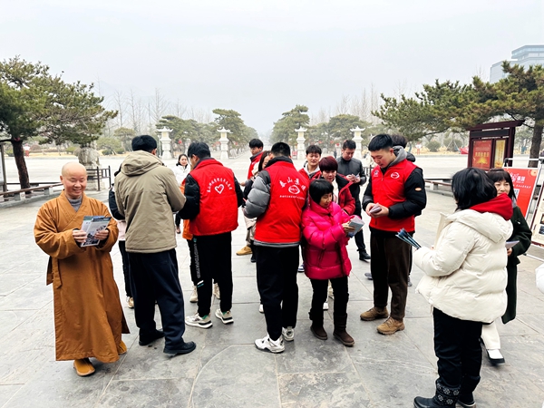 设置咨询服务宣传台,摆放岱庙景区及“学习强国”宣传推介展板。志愿者身穿红色马甲,免费发放泰山、岱庙内容的宣传册页,介绍泰山、岱庙景区景点旅游情况,热情回答游客的旅游咨询。