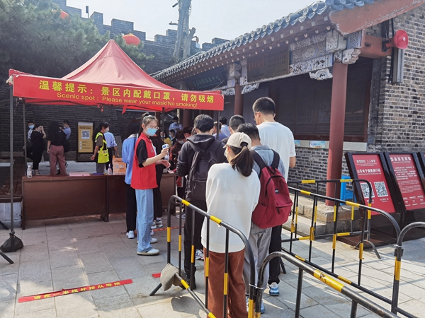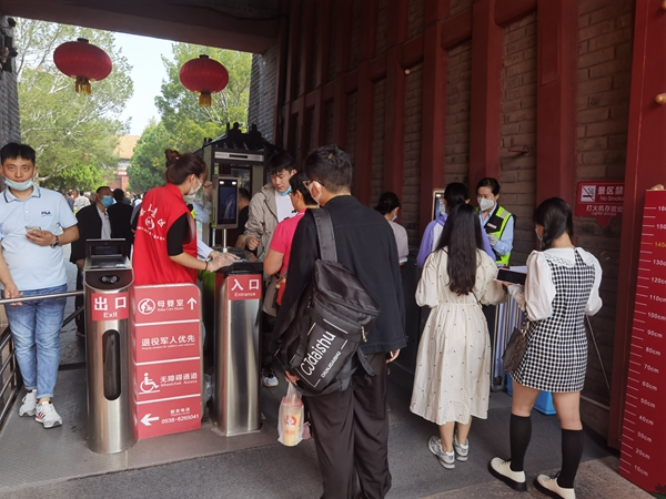 在地质博物馆、配天门、东御座等部位,配合工作人员温馨提示游客戴口罩进入室内,确保游客安全有序参观。