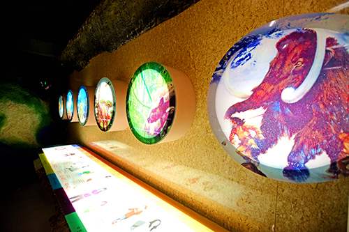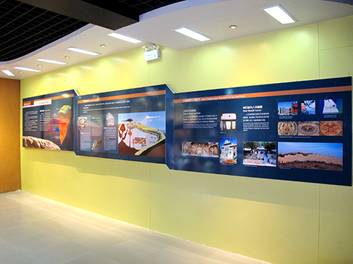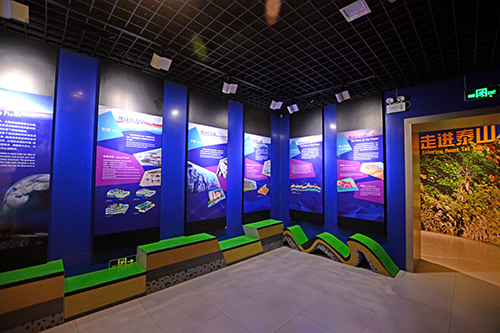 对地球的形成过程、地球历史以及矿物、岩石和地球构造运动等地学知识进行了普及,通过图片、文字、岩石标本的展示形式对地质现象进行了通俗、直观的介绍。利用声光电将全景式泰山沙盘与大屏幕连接,通过同声语音与沙盘同步演示的方式,详细介绍了泰山地质公园的基本概况和地貌特色。