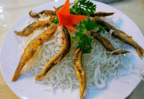 以赤鳞鱼做成菜肴,是泰安传统风味的高档名吃。过去帝王和显要官宦登临泰山,无不以赤鳞鱼为必备之菜,因而当地厨师对赤鳞鱼的烹调技术世代相传,极富特色。基本上分干、汤两种吃法。干炸赤鳞鱼制作时,将鱼腹划一小口,取出内脏,将鱼洗净,每条鱼内放入一颗花椒粒,再放葱椒绍酒中浸腌片刻,取出蘸上层薄面 粉,下入热油锅中,炸成弓形,色泽淡黄色时捞出即成。食时另上一碟椒盐蘸食。脂富而不腻,外焦而里嫩,麻酥的香,辣乎乎的咸,其味回异寻常。