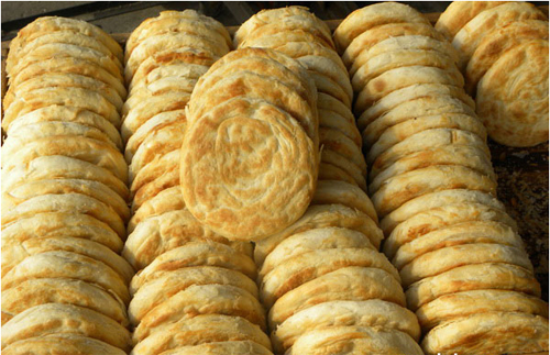 2,把发好的面弄成纪子,用擀面杖干成条,一次在面饼上抹上酥油、还有芝麻或芝麻盐。然后卷起,擀成饼状。贴在炉上。