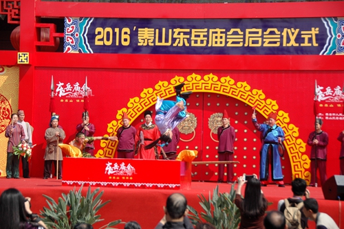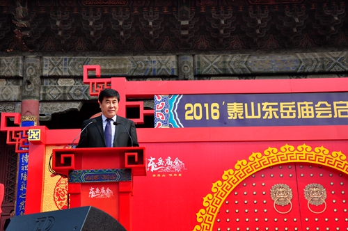 启会仪式上,泰安市副市长徐恩虎宣布2016泰山东岳庙会启会,泰山景区管委会主任姚霆、中国民俗学会副会长刘德龙、国际亚细亚民俗学会韩国会长金京南、中国国民党中央评议委员王素惠分别致辞。