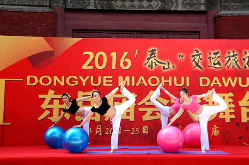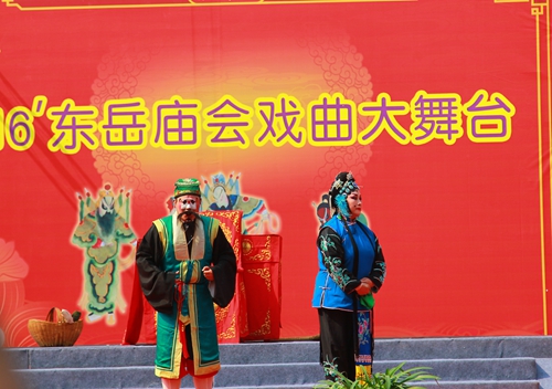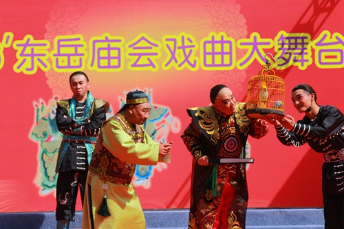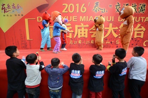 在后寝宫前的东岳庙会大舞台上, COSPLAY、童话剧、曲艺、瑜伽等不同形式的表演,让大家共同关注并参与到活动中。