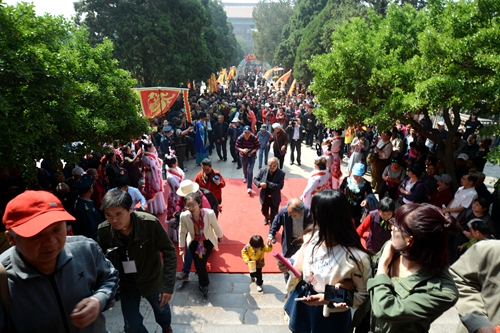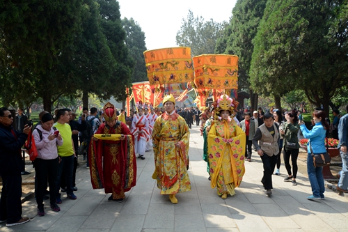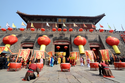 岱庙正阳门外,锣鼓喧天,热闹非凡,威武整齐的仪仗队伍列队排开,香客、游人跟随皇帝皇后共同参与开启古城门活动,体验“走福路、摸福石”随心祈福进香。