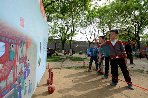 唐槐院内,捶丸、投壶、击铜钱等传统竞技项目区内传来孩子们阵阵欢呼雀跃的声音。通过这些竞技运动,让孩子们在愉悦的活动中了解并传承我们中华民族自己的文化。