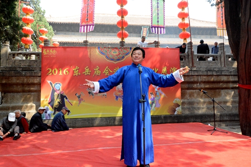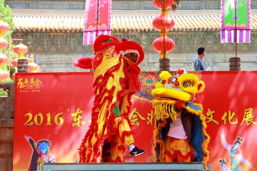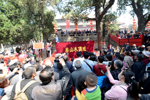 在天贶殿大露台西侧,道教音乐、宁阳木偶戏、舞狮舞龙特技、山东快书、变脸杂耍、汶河大鼓及拉魂腔等非物质文化遗产展演,吸引了不少市民和游客。