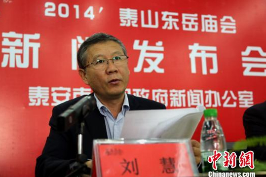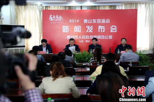 山东省泰安市人民政府10日上午在岱庙举行2014泰山东岳庙会新闻发布会。 梁犇 摄