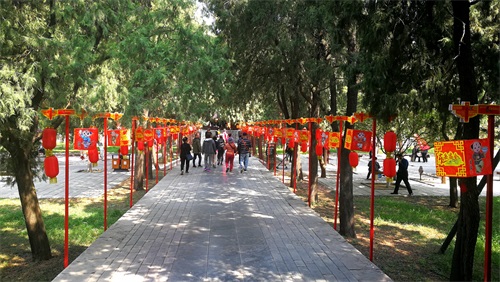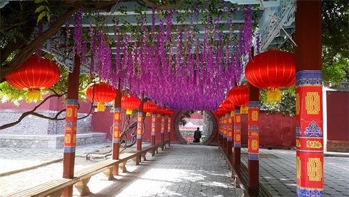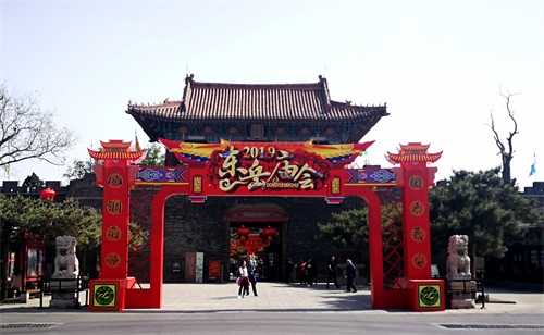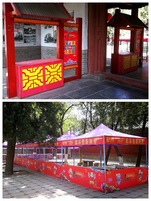 岱庙内,娇艳盛开的牡丹、姹紫嫣红的碧桃,仿佛以最美的姿态在为即将开幕的2019泰山东岳庙会增色。城墙上锦旗飘扬,大红灯笼高悬,以红色为主的喜庆装饰布满院内,南北门庙会牌坊和吉庆门已搭建起来,商铺展示棚已就位,各活动展示区展板也已在紧锣密鼓的紧张布置中,热闹繁华的庙会气氛浓厚,千年庙会今时再现,将迎接来自四面八方的游客。