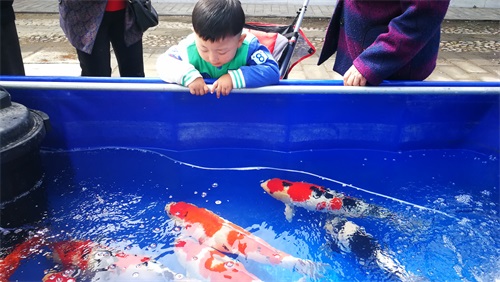 锦鲤象征富贵、吉祥。在本届庙会上,首次展示了红白、大正三色、丹顶、昭和三色等多个中高端日本锦鲤品种,看着在水中气定神闲、姿态婀娜、贵气十足游来游去的锦鲤,让不少游客和孩子兴奋不已。