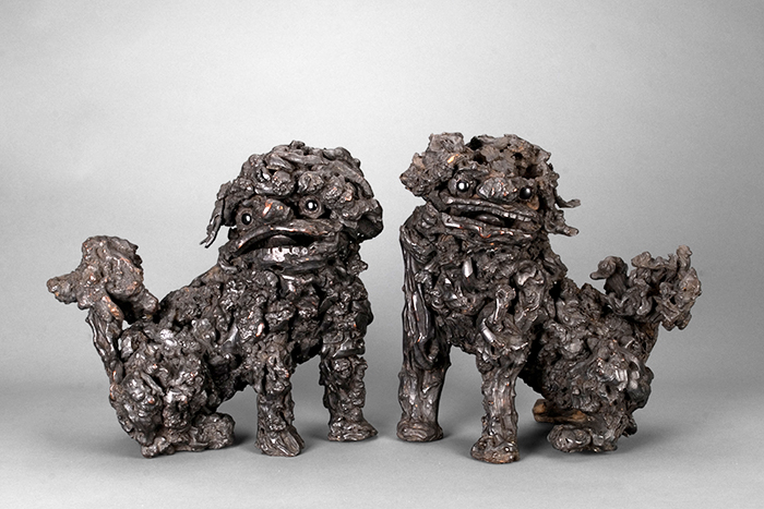 清乾隆二十七年(1762年)御赐岱庙,泰山镇山三宝之一。狮子为一对,用沉香树根雕刻粘合而成,两狮通体乌黑,作蹲踞状,此器物利用树根的天然造型,将狮子雕凿得形神兼备。狮子是民间传统的吉祥物,质地又是名贵的沉香木,足见乾隆帝对泰山的敬奉之意。