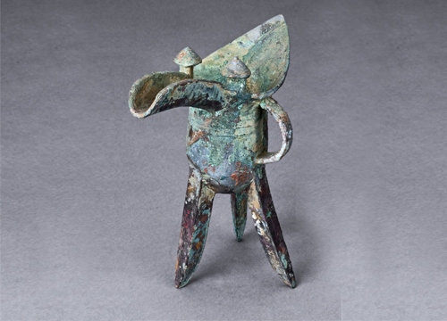 宽流,尖短尾,近流处有双菌柱,柱面上有圆涡纹,卵形深腹,圜底,旁有带状桥形鋬可执,腹下承三足,三足截面呈三角形;腹环饰弦纹三条。