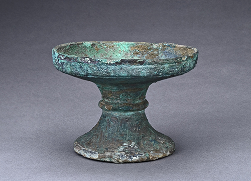 敞口,平沿,浅斜直腹,微圜底,短粗柄,柄中部环一凸棱,喇叭形圈足;盘外壁及豆柄上部均饰重环纹,圈足环饰波曲纹。