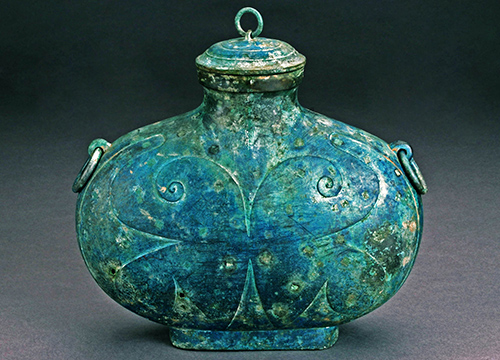 壶身扁椭圆形,直口,长方形圈足,肩部饰双兽首衔环耳,半圆盖,盖中间一蛇背拱为钮附衔环;盖上饰柿带纹,腹饰花叶纹。