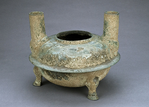 直口,圆腹,三蹄足,素面,肩部双筒形耳与腹贯通,腹中出平沿。