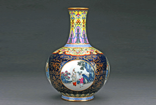 清乾隆年间御赐岱庙。撇口,长颈,腹部浑圆似球状,圈足,颈部为黄地粉彩宝相花纹、缨络纹、变形蕉叶纹和回形纹;肩部云纹中黄地饰粉彩花卉纹;腹部霁蓝地饰描金缠枝莲纹,四面圆形开光内绘婴戏图;腹下部环饰粉彩仰莲,圈足环饰回形纹,口沿、底沿均描金,底有“大清乾隆年制”篆书红款。
