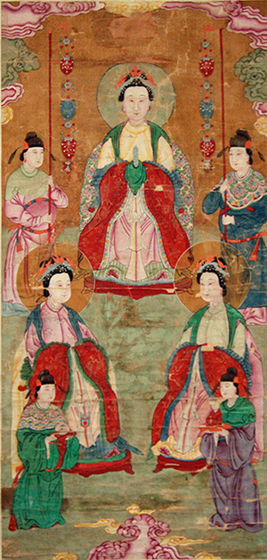 明万历御赐。神轴采用传统工笔重彩人物画法,勾勒、设色讲究,人物形态生动、服装衣饰线条流利婉转,着色浓重,富丽堂皇,其表现的内容与泰山宗教息息相关,带有浓厚的地方色彩,透过这些浓墨重彩,可以反映出泰山宗教思想和宗教在历史发展史上的地位。