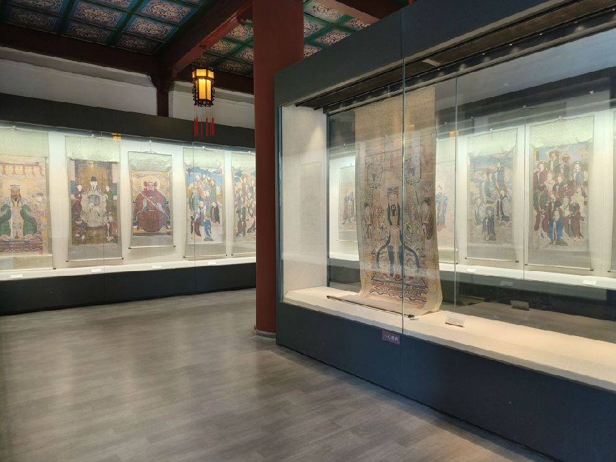 神轴,也称神仙画,是将以神、仙为内容的绘画装裱而成的画轴或画片,专门悬挂于庙内。泰安市博物馆馆藏的这批神轴,均为明清两个时期的作品,汇集了泰山上下庙宇中的精品。这些神仙画的内容与泰山宗教信仰息息相关,反映泰山民间信仰诸神的内容占了很大比例,带有明显的地方特色。透过这些浓墨重彩的神仙画,可以看到人们在不同时期对神的理解和认识,可以领略到岱庙在泰山宗教发展史上的地位,了解这些神仙画所反映出的宗教思想和历史意义。