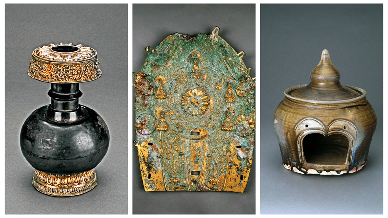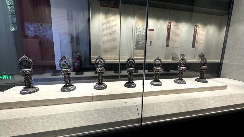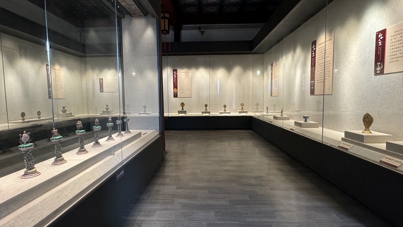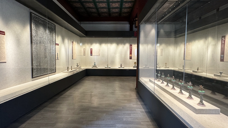 值此国庆佳节,泰安市博物馆遴选50余件具有文化交融印记的文物以飨观者。其中,秦泰山刻石、宋封祀坛颂碑、金重修东岳庙碑、元武穆王神道碑、清乾隆重修岱庙碑等,镌刻各朝历史事象;北宋大观通宝、南宋淳祐元宝、西夏天盛元宝、金正隆元宝、元至大通宝等,铸记钱币“通行四方”“四夷共享”的经贸流通;北魏鎏金铜背屏、隋青釉舍利子瓷塔、宋白釉刻花瓷枕、元钧窑斑彩三足瓷炉,承载各代文化脉络;清珐琅釉银七珍、画珐琅铜八宝、八宝纹瓷贲巴壶、鎏金银贲巴瓶、泥金卷云纹瓷法轮等,造型精美,富丽堂皇,皇家气象中凸显民族风彩……一室珍宝,具现和合气象。