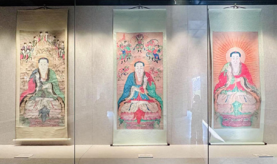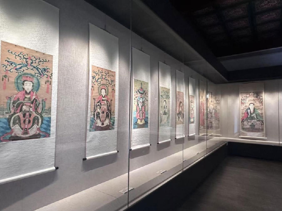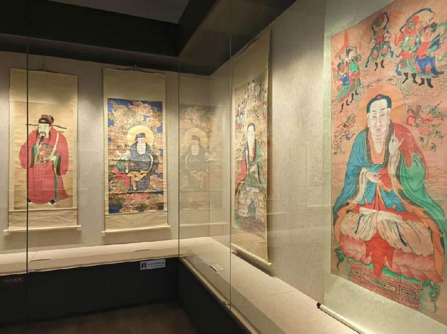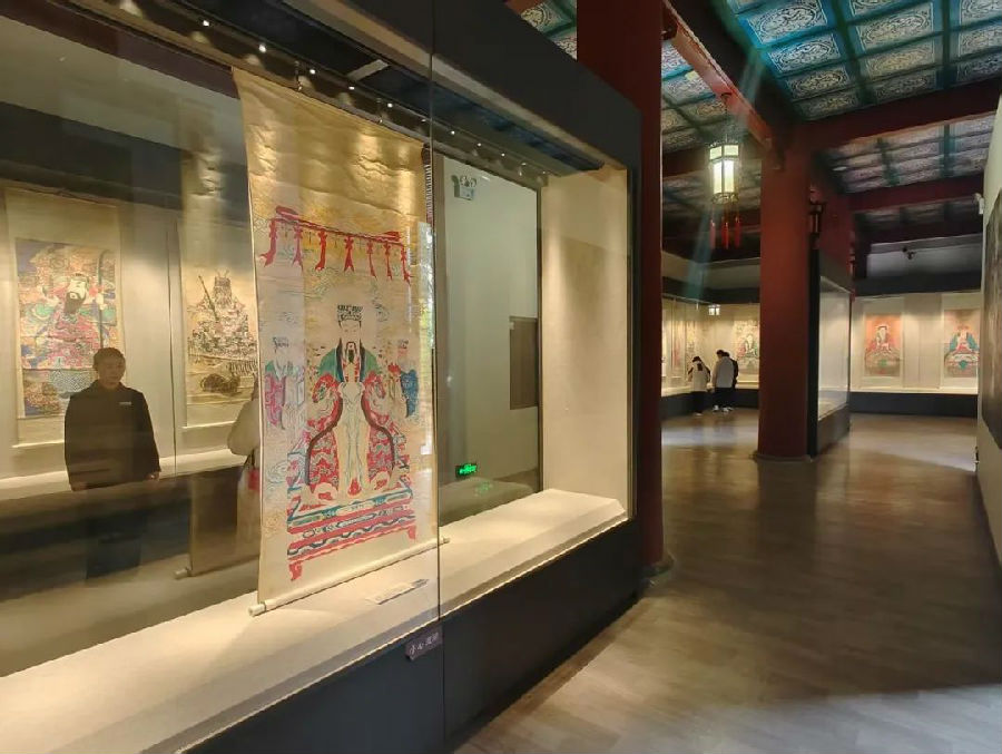 神轴,也称神仙画,是将以神、仙为内容的绘画装裱而成的画轴或画片,专门悬挂于庙内。泰安市博物馆馆藏的这批神轴,均为明清两个时期的作品,汇集了泰山上下庙宇中的精品。这些神仙画的内容与泰山宗教信仰息息相关,反映泰山民间信仰诸神的内容占了很大比例,带有明显的地方特色。透过这些浓墨重彩的神仙画,可以看到人们在不同时期对神的理解和认识,可以领略到岱庙在泰山宗教发展史上的地位,了解这些神仙画所反映出的宗教思想和历史意义。