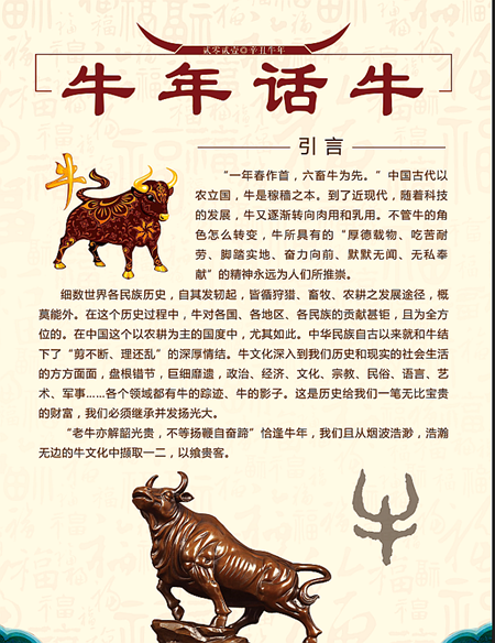“一年春作首,六畜牛为先。”中国古代以农立国,牛是稼穑之本。到了近现代,随着科技的发展,牛又逐渐转向肉用和乳用。不管牛的角色怎么转变,牛所具有的“厚德载物、吃苦耐劳、脚踏实地、奋力向前、默默无闻、无私奉献”的精神永远为人们所推崇。