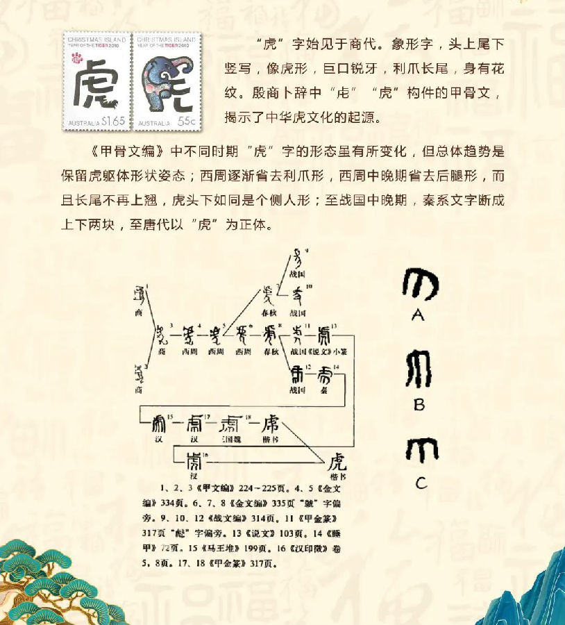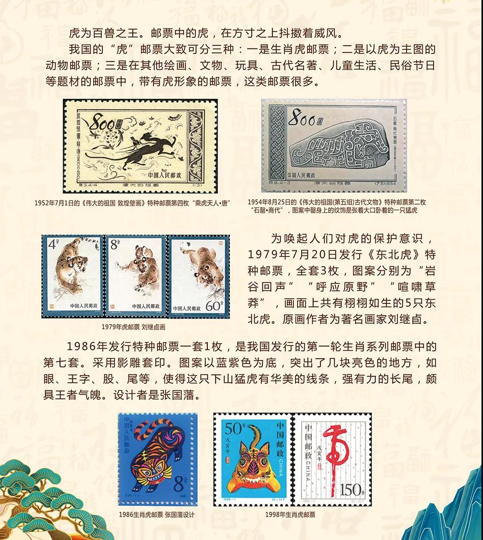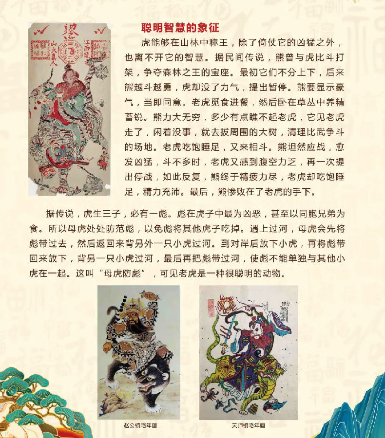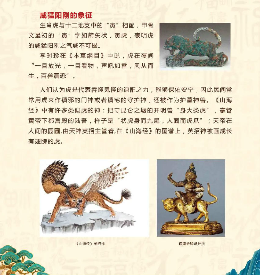虎被誉为兽中之王。寅虎,十二生肖之一,地支的第三位,寅时老虎最活跃、最凶猛。在人类与虎的长期接触当中,逐渐认识到虎是一种凶猛强大的动物,有人类所畏惧和不可战胜的力量,又由于虎的形象和习性的特殊性,在中国人心目中,虎天生就具有一种王者风范。人们从对虎的痛恨到喜爱,再到把虎看成无所不能的山神和人类的祖先,最后形成丰富多彩的虎文化。