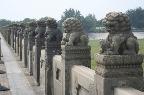 比较有名的狮子包括天安门前的狮子,中山公园社稷坛门外的狮子,北京大学门前的狮子,沧州铁狮和卢沟桥望柱上的四百多只狮子,俗话说“卢沟桥的石狮子——数不清”。北京天安门金水桥前后,各有一对点缀性的大石狮子,左雄右雌,雕刻得极为精美。右侧石狮子的腹部有一块伤痕。关于这道伤痕有两个传说:一是说,明代时的将领李国祯被著名的农民起义军领袖李自成追击,躲藏在石狮子的后面,李自成发现了,举剑狠狠刺去,结果使石狮子受到误伤;另一说,八国联军入侵北京,石狮子被侵略军所破坏。