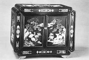 明代嘉靖年间,扬州有一位名叫周筑的漆器工匠,他巧妙利用珍珠、珊瑚、玉石、水晶、玛瑙等名贵材料的质感和颜色,组合成山水人物、花卉翎毛等装饰图案,然后镶嵌在漆器或者木器上,人们为它取名百宝嵌。由于当时周筑被奸臣严嵩所控制,所以制作出来的百宝嵌也仅供权贵们享用。直到严嵩败落后,百宝嵌工艺才开始传入民间。到了清代乾隆时期,百宝嵌工艺盛极一时。除扬州外,北京的清宫造办处和广州的工匠们都善于制作这种五光十色、富丽堂皇的制品。