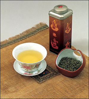 湖南省洞庭湖的君山出产银针名茶,据说君山茶的第一颗种子还是四千多年前娥皇、女英播下的。后唐的第二个皇帝明宗李嗣源,第一回上朝的时候,侍臣为他捧杯沏茶,开水向杯里一倒,马上看到一团白雾腾空而起,慢慢地出现了一只白鹤。这只白鹤对明宗点了三下头,便朝蓝天翩翩飞去了。再往杯子里看,杯中的茶叶都齐崭崭地悬空竖了起来,就像一群破土而出的春笋。过了一会,又慢慢下沉,就像是雪花坠落一般。明宗感到很奇怪,就问侍臣是什么原因。侍臣回答说“这是君山的白鹤泉(即柳毅井)水,泡黄翎毛(即银针茶)缘故。”明宗心里十分高兴,立即下旨把君山银针定为“贡茶”。君山银针冲泡时,棵棵茶芽立悬于杯中,极为美观的。